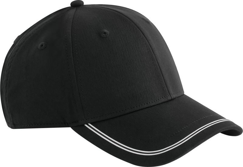 Gebogener Schirm, 2 Silikon Druck Streifen in Kontrastfarbe am Kappenschirm, weiches Schweissband, Frontpanele verstärkt, gestickte Luftlöcher, Stoffband mit tri-glide Schnalle, feuchtigkeitsregulierend, Tear Away Label, nur mit einem Schwamm reinigen, nicht waschen