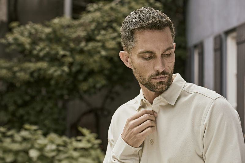 Leicht taillierter Schnitt, Polokragen aus gleichem Material, Manschetten mit Knöpfen, hergestellt aus langstapeliger Baumwolle, 40° waschbar, nicht trocknergeeignet